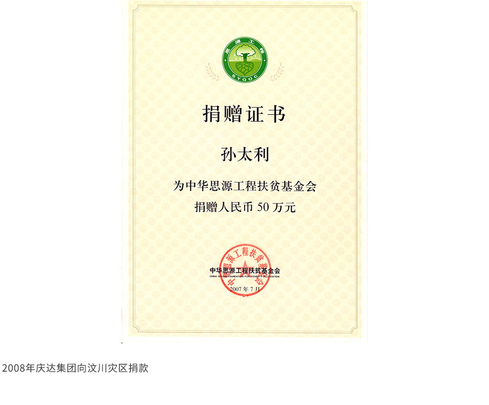 孫太利董事長是中華思源工程扶貧基金會(huì)發(fā)起人之一,第一屆理事會(huì)理事,現(xiàn)為名譽(yù)理事。他積極響應(yīng)民建中央號(hào)召,依托中華思源工程扶貧基金會(huì),為廣大民建會(huì)員及有關(guān)愛心人士,搭建公益平臺(tái),平臺(tái)緊緊圍繞貧困地區(qū)的教育培訓(xùn)、醫(yī)療衛(wèi)生、抗災(zāi)救災(zāi)、助殘濟(jì)困、幫幼敬老、文化環(huán)保等多個(gè)領(lǐng)域開展公益事業(yè),平均每年幫扶困難群眾百余萬人次,募集金額十幾億元。